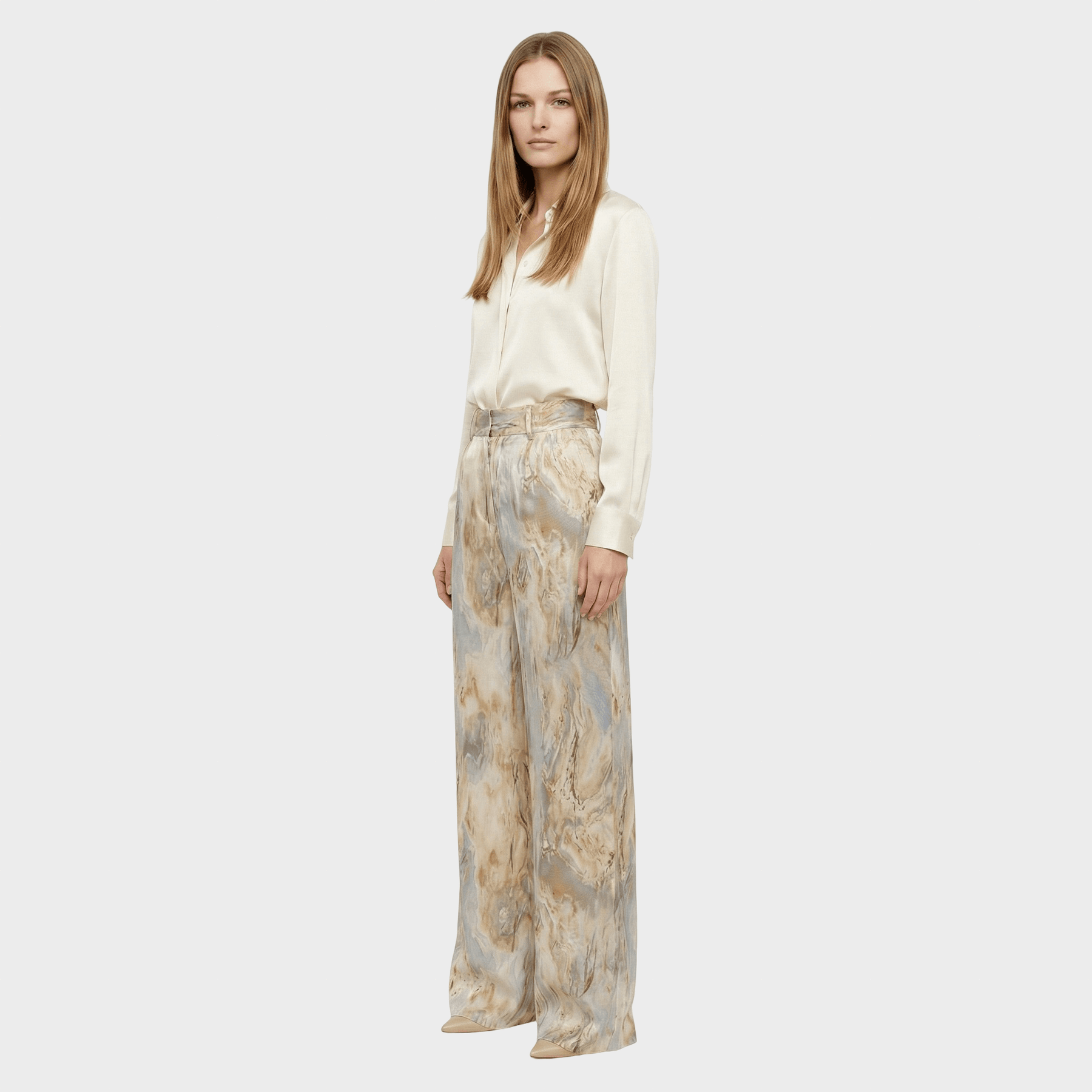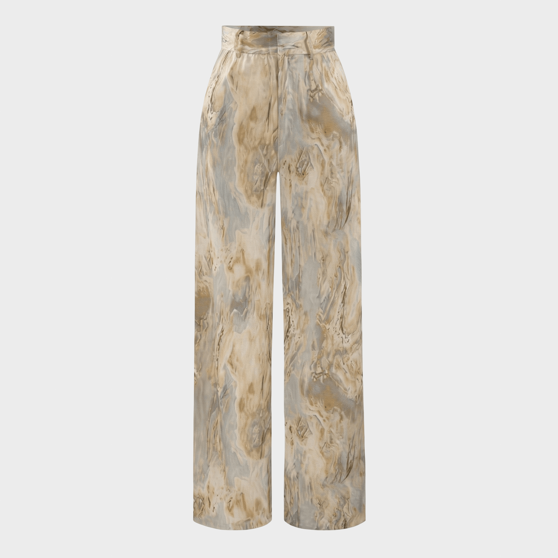 Atrodykite stilingai su šiomis ilgomis tiesiomis kelnėmis, turinčiomis išraiškomis marmuro raštą, kuris pabrėžia jūsų dėmesį. Jos sukurtos su aukštu liemeniu ir laisvu kirpimu, siūlančiu modernią struktūrą su lengvu judėjimu—idealiai tinka kasdienėms dienoms, kai reikia drąsios stiliaus.