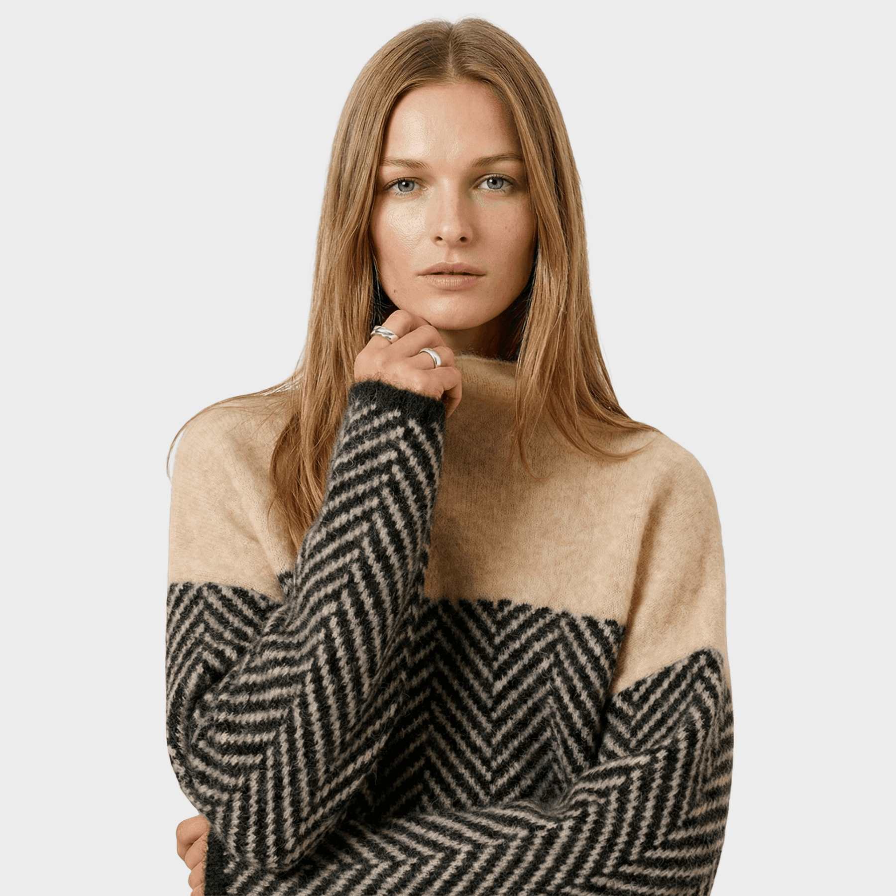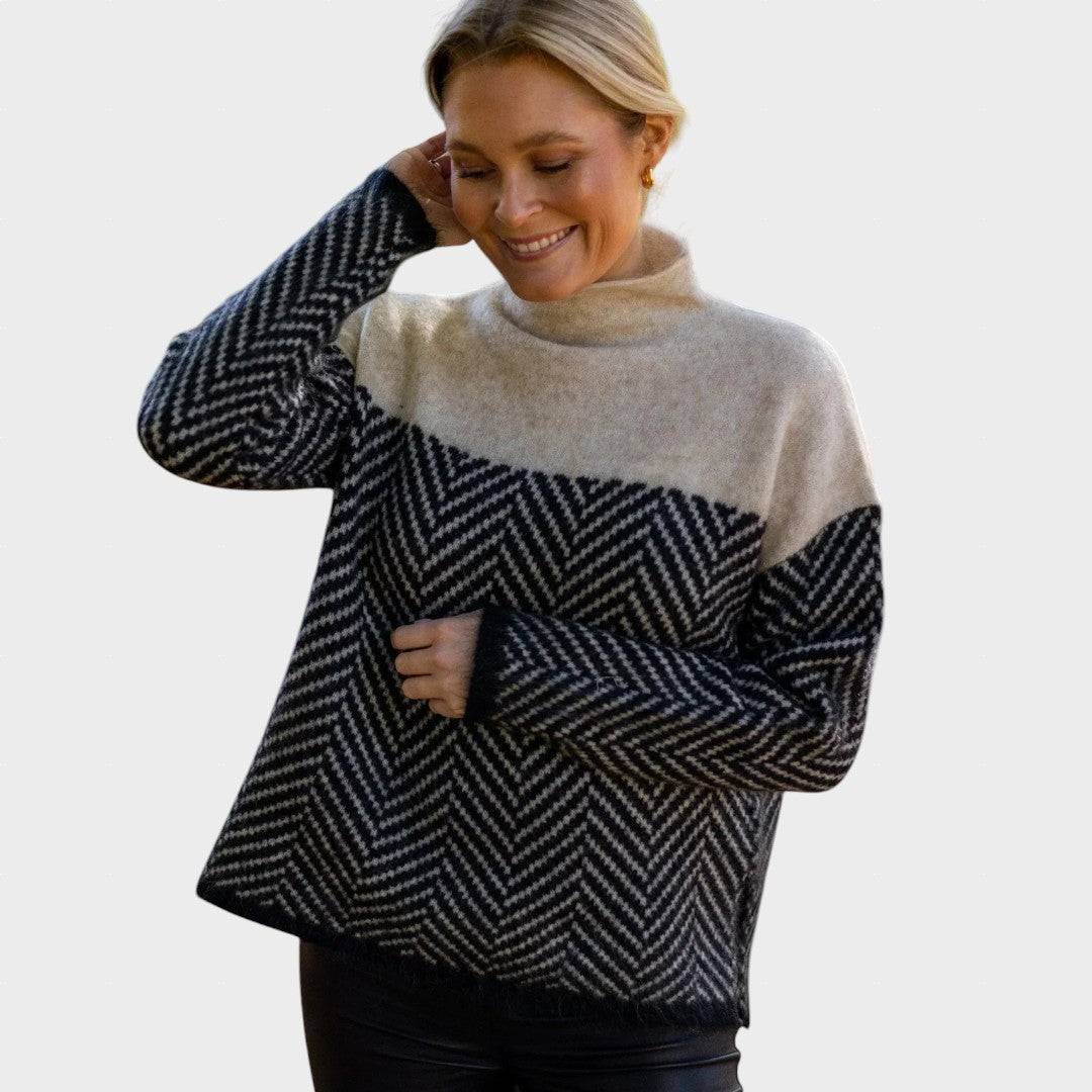 Šis megztinis su originaliu raštu ir moderniu siluetu yra skirtas moteriai, kuri vertina unikalumą. Stilingas aukštas kaklas suteikia papildomos šilumos bei elegancijos, o rašto kontrastas – tai subtili detalė, kuri pabrėžia jūsų individualumą. Puikiai tinka tiek jaukiam savaitgalio poilsiui, tiek miesto pasivaikščiojimams.