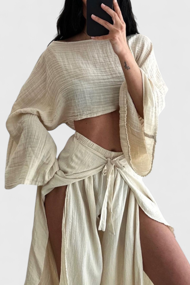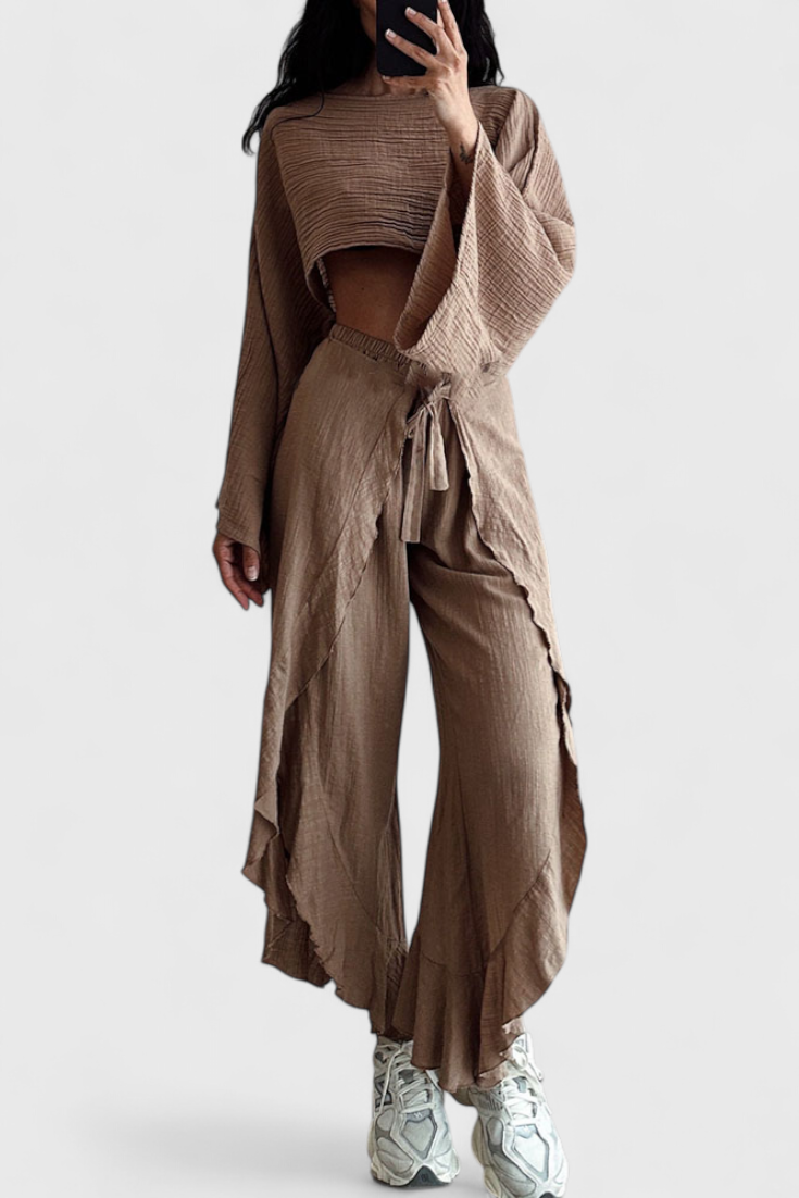 Patogumas su drąsiu akcentu. Maeva komplektas sujungia trumpą, laisvą topą su šoniniu atvartu ir laisvas aukšto juosmens kelnes su juostele liemenyje, siūlydamas modernią ir universalią siluetą. Jo lengvas audinys ir minkštas kritimas daro jį idealiu pasirinkimu stilingoms atsipalaidavusioms dienoms.