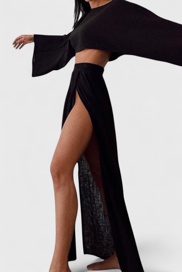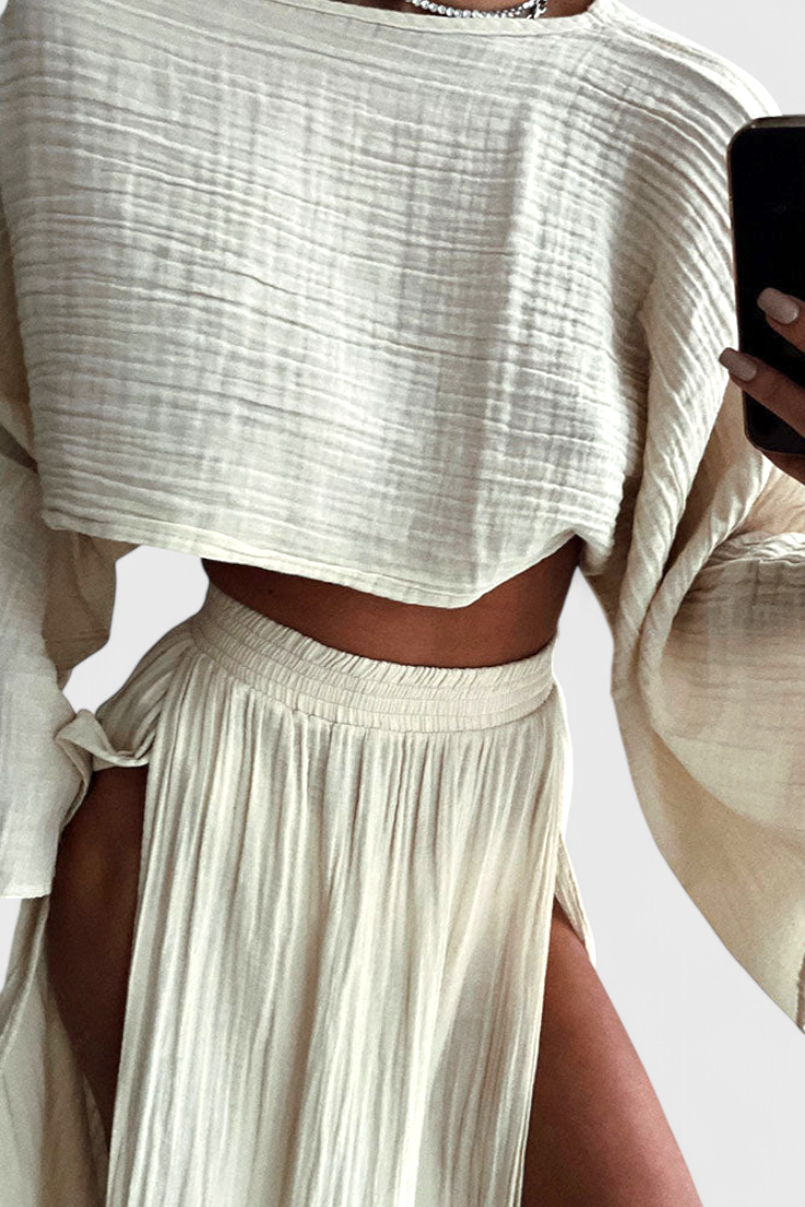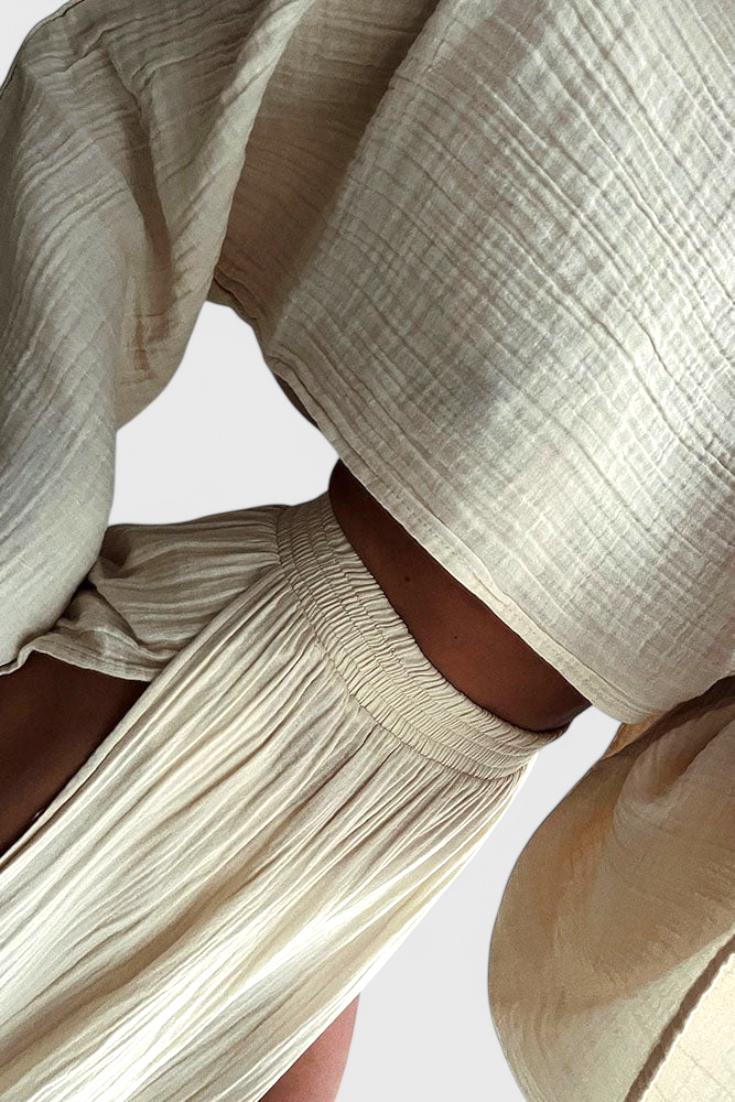 Lengvas, rafinuotas ir sukurtas palikti įspūdį—Martha komplektas sujungia modernų stilių su laisvu siluetu. Jo lengvas trumpas topas ir sijonas su šoniniu įpjovimu sukuria tobulą pusiausvyrą tarp elegancijos ir gaivumo, puikiai tinkantis saulėtoms dienoms ar ypatingoms naktims.