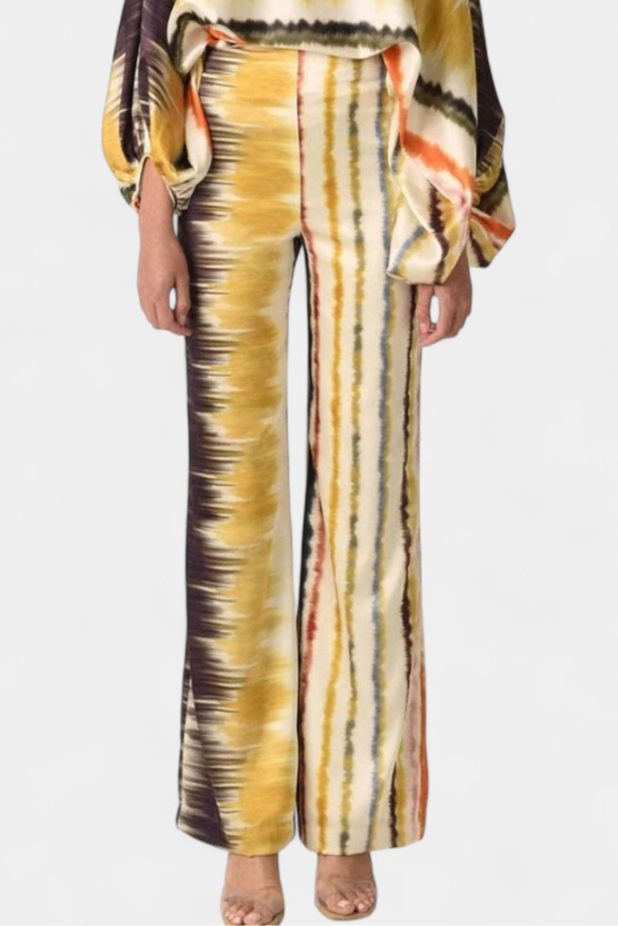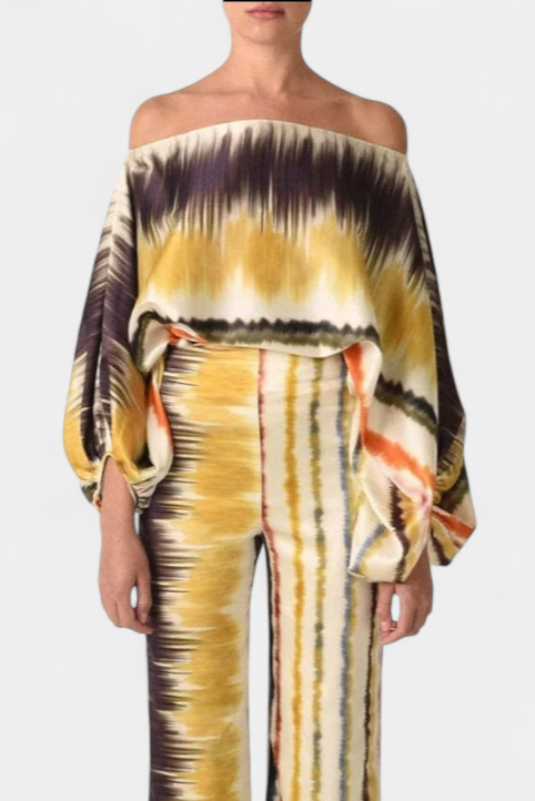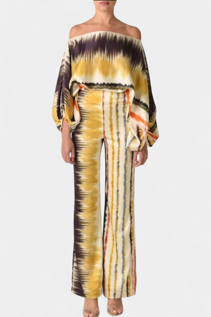 Sybella komplektas sujungia bluzoną su atvirais pečiais ir pūkuotomis rankovėmis su plačiomis kelnėmis ir meniniu raštu. Sukurtas, kad užtikrintų sklandų siluetą su asmenybe, jis yra puikus saulėtoms dienoms, atsipalaidavimui ar stilingiems susitikimams.