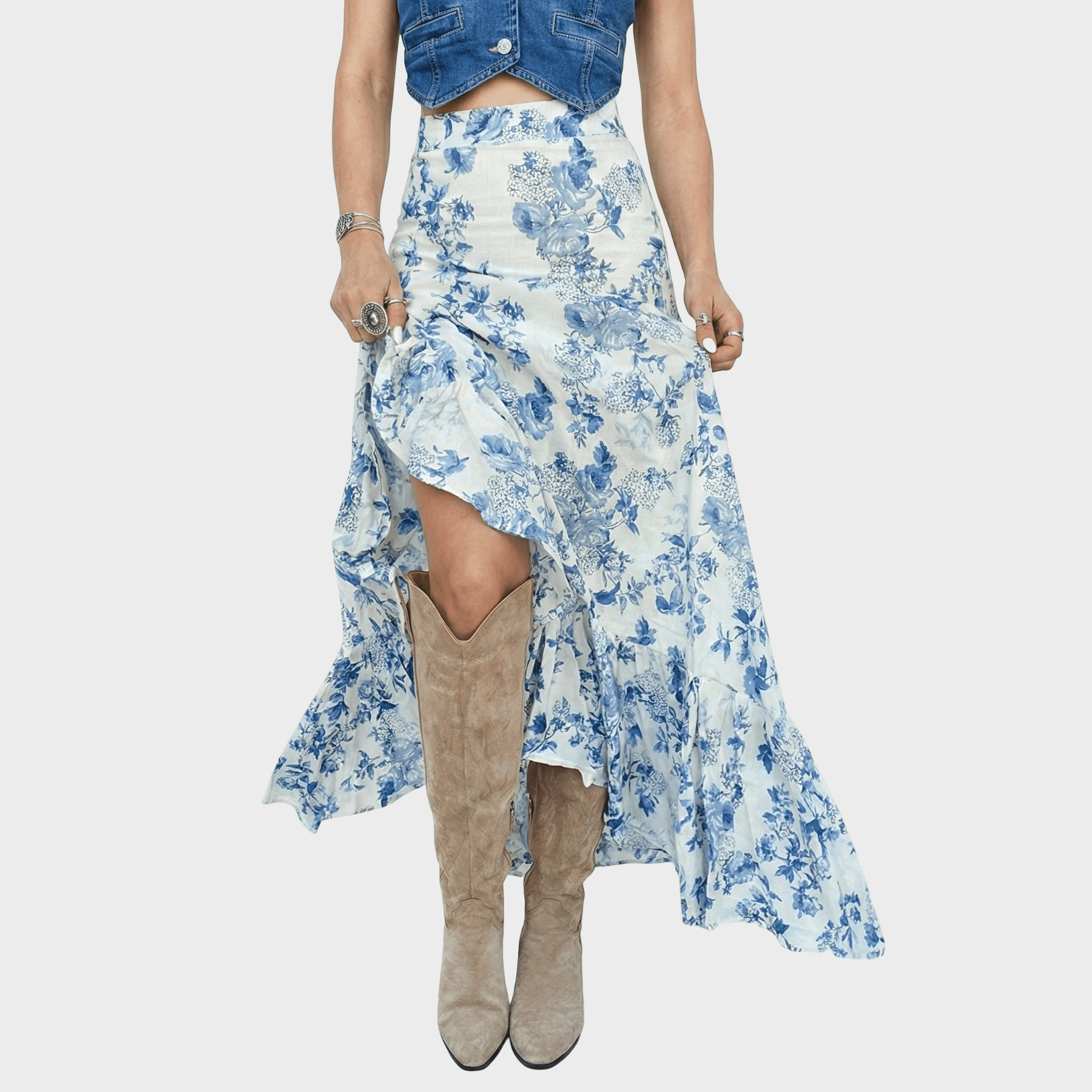 Dizainas su pietų esme, kuris sujungia moteriškumą ir laisvę. Kala išsiskiria plazdančiu siluetu ir mėlynu gėlių raštu ant balto fono, idealiai tinka dienai gamtoje arba moderniam boho įvaizdžiui. Aukšta juosmens linija pabrėžia figūrą, o ją papildo subtilūs volanai ir šoninis atvėrimas, suteikiantis judėjimo ir charakterio.