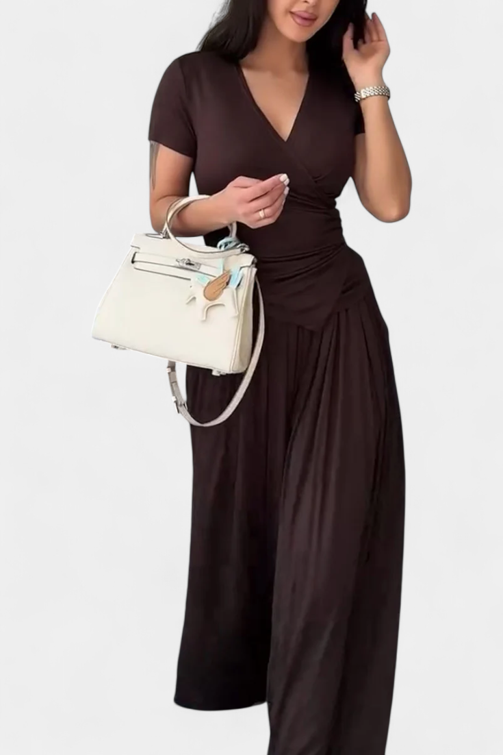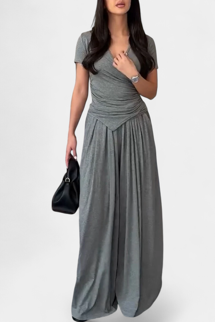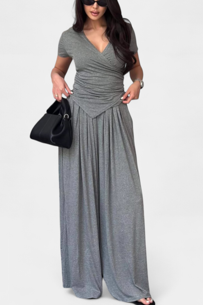 Modernus komfortas su moteriška aura. Ruslana komplektas sujungia švelnumą ir stilių atsipalaidavusio silueto, kuris prisitaiko prie bet kokio ritmo. Jos kryžminis viršus natūraliai pabrėžia figūrą, o plačios kelnės laisvai plūsta, sukurdamos idealų įvaizdį, kad su malonumu judėtumėte bet kuriame neformaliame renginyje.